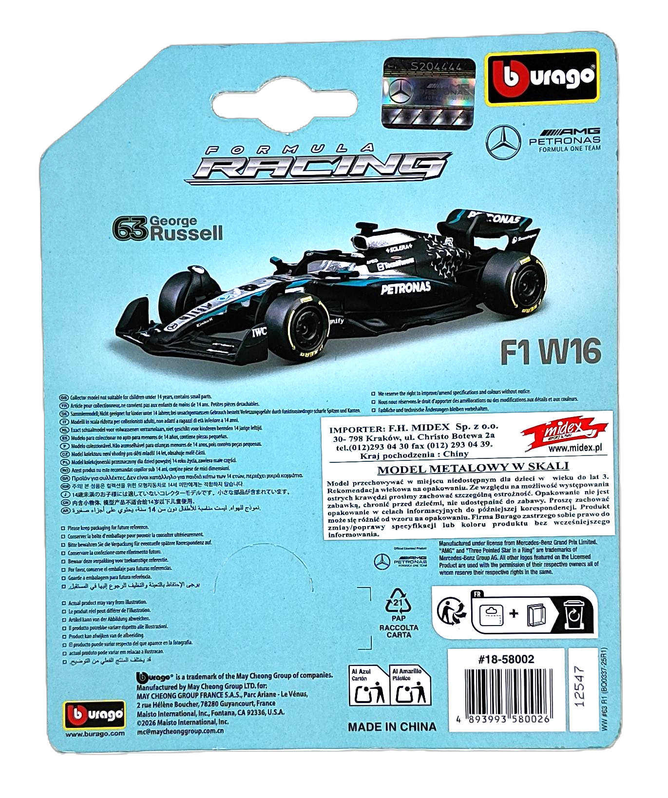 - Produkt może różnić się od wzoru na opakowaniu. Firma Burago Zastrzega sobie prawo do zmiany/poprawy specyfikacji lub koloru produktu bez wcześniejszego informowania.