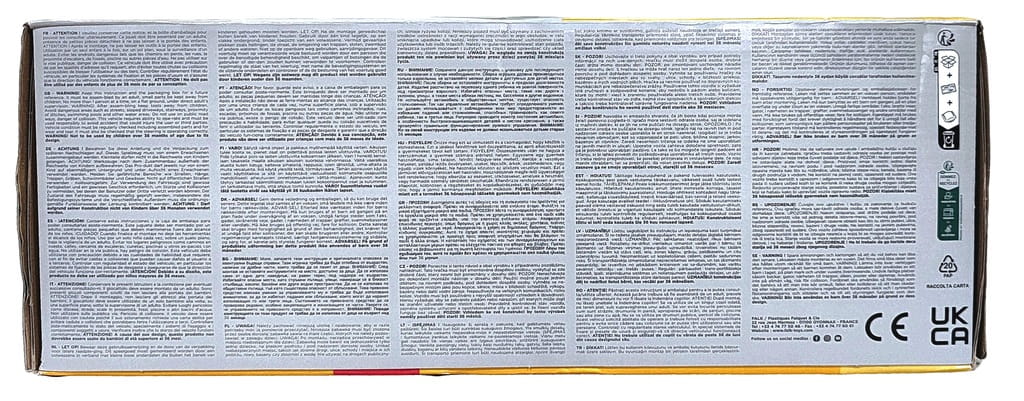 - UWAGA! Należy zachować niniejszą ulotkę i opakowanie, aby w razie potrzeby móc ją ponownie przeczytać. Niniejsza zabawka musi być złożona przez osobę dorosłą: zabawka zawiera małe części, których nie należy pozostawiać w zasięgu dzieci.