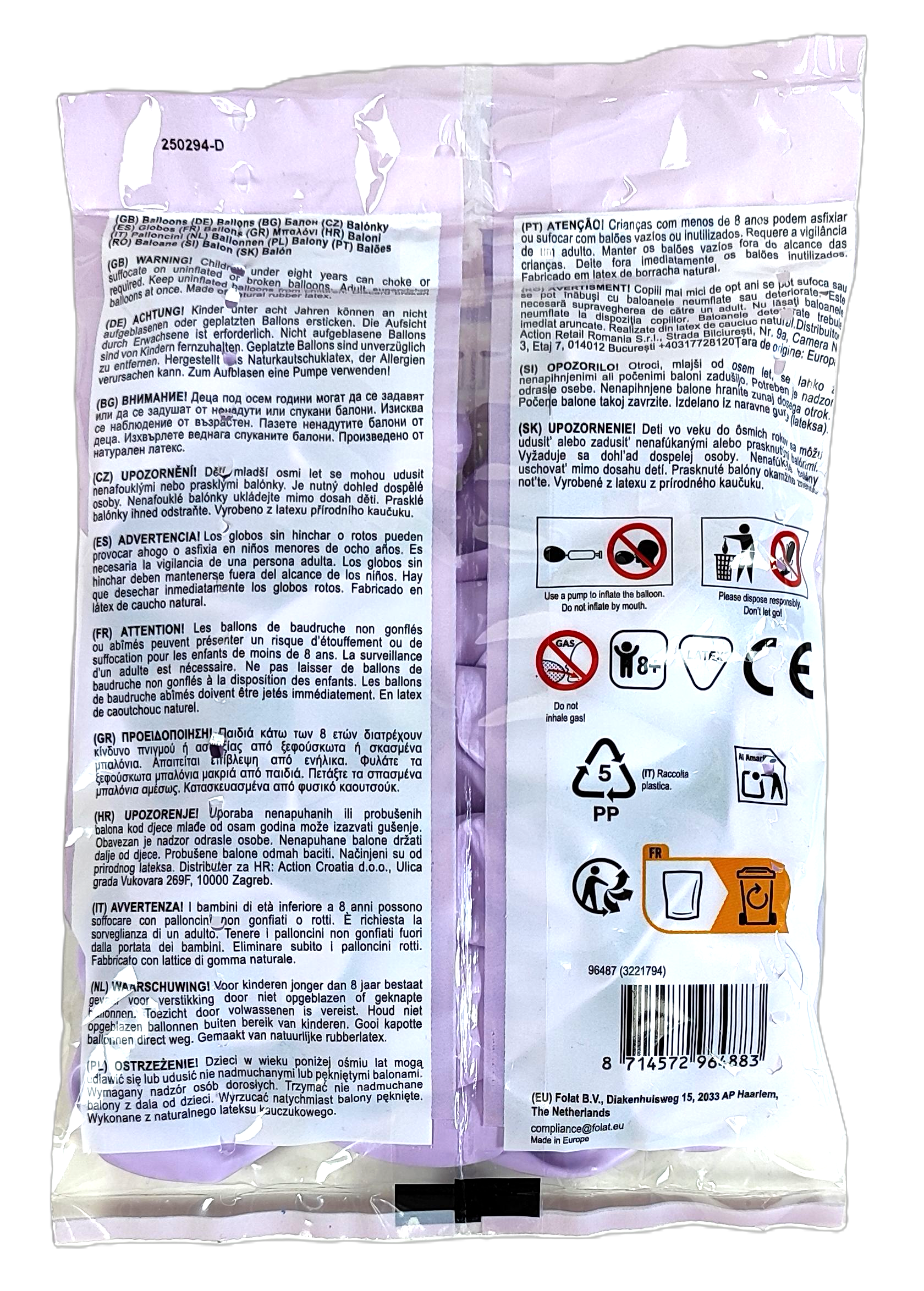 - Ostrzeżenie! Dzieci w wieku poniżej ośmiu lat mogą udławić się lub udusić nie nadmuchanymi lub pękniętymi balonami. wymagany nadzór osób dorosłych. Trzymać nie nadmuchane balony z dala od dzieci. Wyrzucać natychmiast balony pęknięte. Wykonane z naturalnego lateksu kauczukowego.