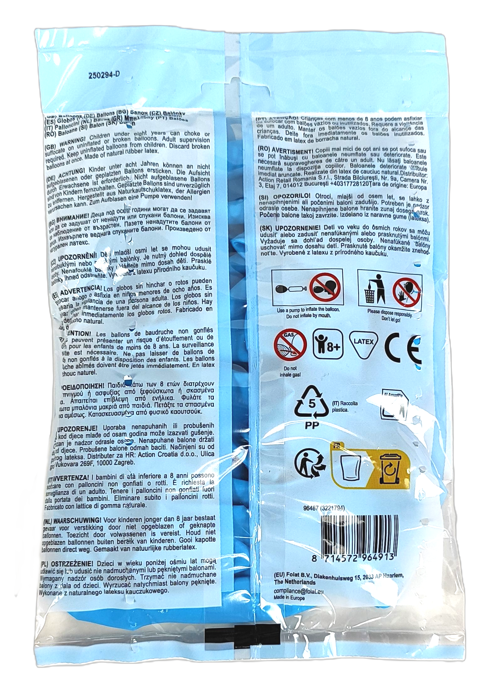 - Ostrzeżenie! Dzieci w wieku poniżej ośmiu lat mogą udławić się lub udusić nie nadmuchanymi lub pękniętymi balonami. wymagany nadzór osób dorosłych. Trzymać nie nadmuchane balony z dala od dzieci. Wyrzucać natychmiast balony pęknięte. Wykonane z naturalnego lateksu kauczukowego.
